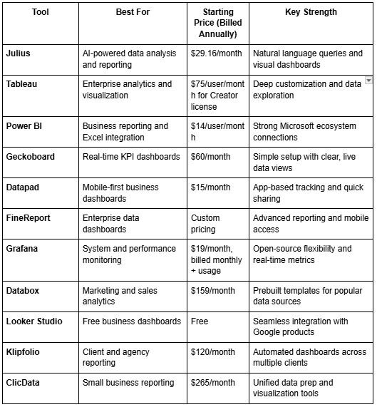 Tableau and Power BI still excel for deep modeling and enterprise control, while Geckoboard and Datapad work well for speed and simplicity. But if your goal is to make insights part of everyday teamwork instead of a technical process, Julius is the one I’d start with.