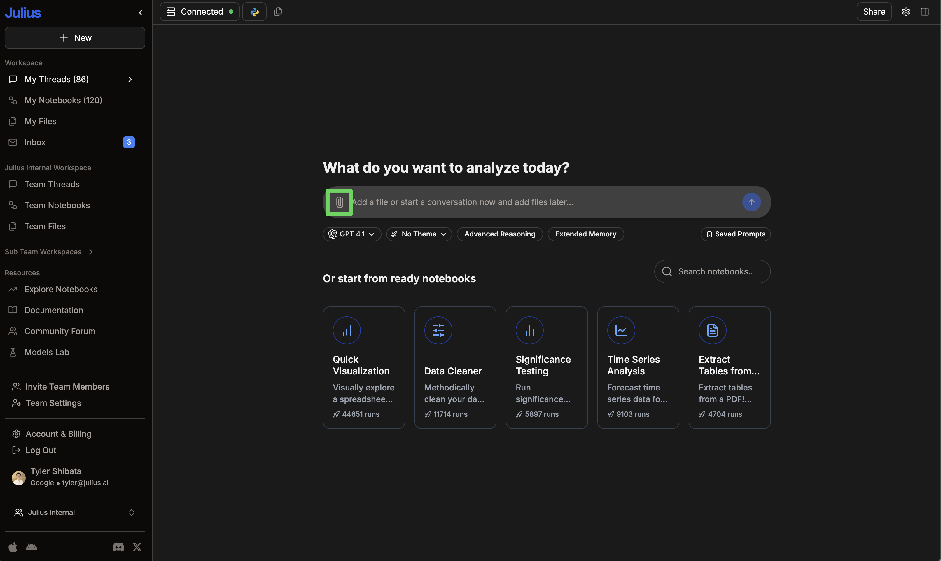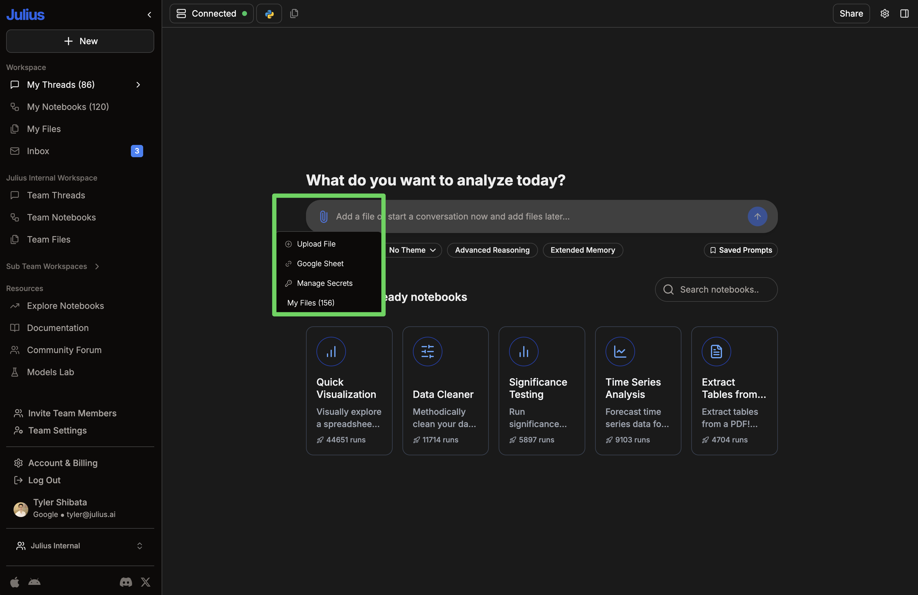 Once a data source is linked and a conversation started, you can ask Julius to analyze and transform the data using natural language commands. For example: